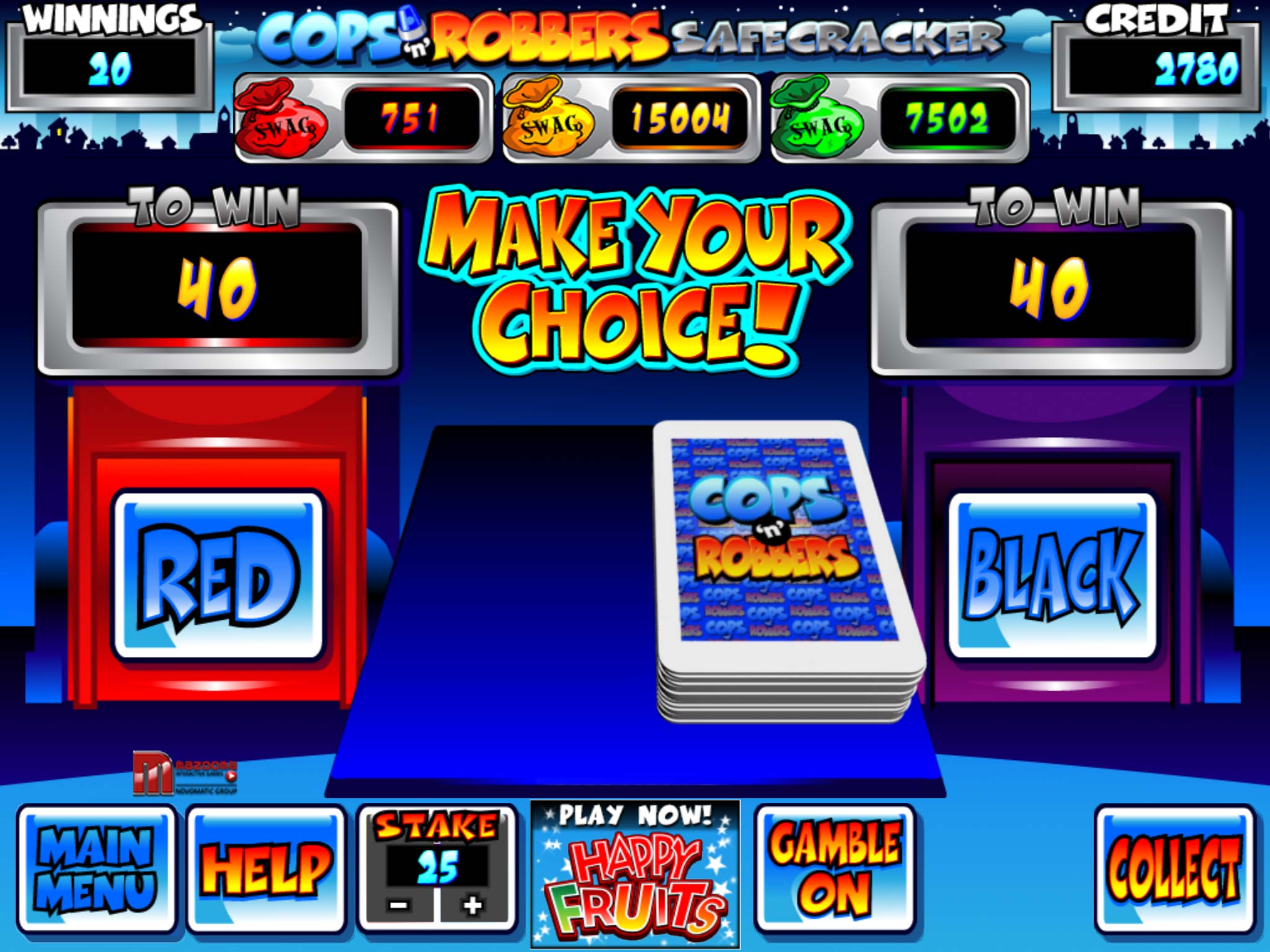 What is really fun about this slots game is that being a singular theme allows the developer to focus on bonuses and expand upon the chosen theme. With the normal slots game, which is a 5-Column slot format, you get pay outs for three/four/five-in-a-row matches. You’ll see the standard 10, J, Q, K, A letters for slots, with a Police Officer being the second highest, and the “Cops ‘n’ Robbers” logo for the highest pay out. There are also bulldogs that stand in as the Wild. You are able to gamble your winnings at the end of a roll by way of a 50% chance predicting a Red or Black card being drawn. This option can be toggled on and off as you desire and you can increase your bet in increments of 25, and after 100, increments of 100. This allows you to fine tune how much you want to use, and the Auto Play toggle will show how many spins you can play at the current stake level before you turn Auto Play on again.