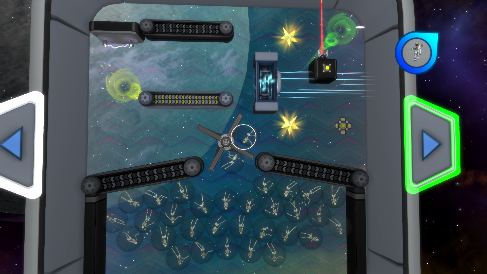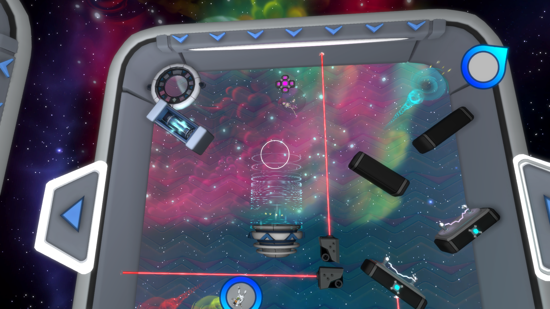 Stop me if you heard this before, Nebulous is a simple concept with a complex design. The simple part is getting the astronaut, Dash Johnson, from point A to point B, and the complex part is all the stuff they put to hinder that. At the end of every puzzle, there is a blue wormhole that takes Dash from one level to the next, from there the player has to avoid touching the outer walls of the course and the hazards set throughout it. These could be anything from electricity to even lasers, but touching any of these hazards makes Dash explode into a shiny green light. To avoid his explode-y demise, each level grants several items to guide Dash to safety. There is quite the assortment too, including objects like ramps, simple walls and even object that bounce Dash. They’re also well needed because the game is quite hard.