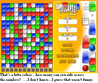 Collapse Deluxe is the deluxe version of Collapse, and as you may or may not know, Collapse is a game that looks kind of like Tetris, but isn’t. In this game, you point and click, over and over and over. You have to click the different colored boxes if there is 3 or more connected. Not diagonally though, that would be too easy.