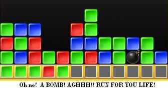 Its easy gameplay, you point and click and hope you don’t get the boxes all the way up to the top without being able to click anything. The boxes appear out of the bottom, and as you go on through the levels it goes faster…so you have to go faster. Don’t be frightened about the bomb though, it won’t hurt you, it’ll actually help you, cause it blows the shit out of everything around it. BWAHAHAHAHA!!!