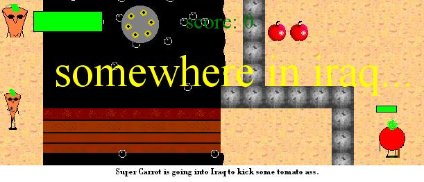 You are Super Carrot. Super Carrot is a really cool character and this game, coming from Urisoft, is really good compared to the other games this guy has made. Super Carrot starts out in Iraq, and he’s out to make ketchup out of all the tomatos, jump over boiling oil, and run over retractable spikes.