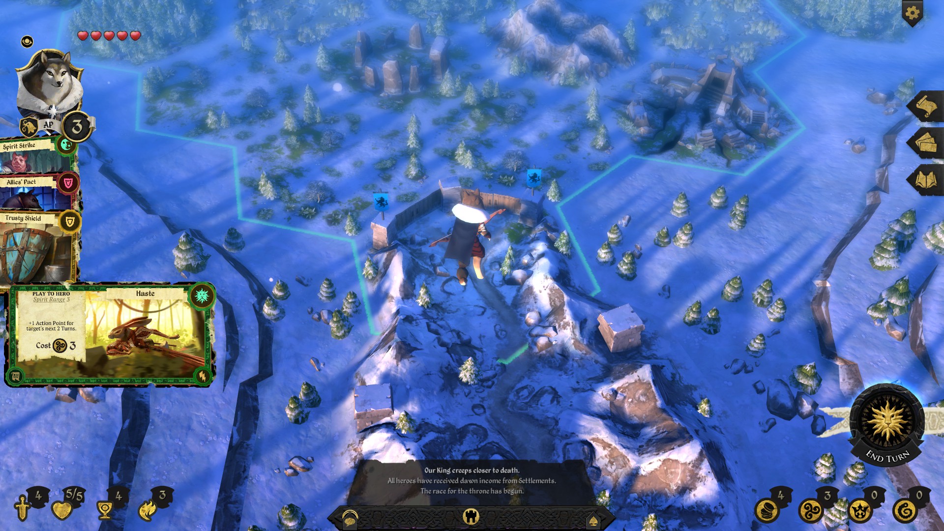 To win the game, you are able to do a number of different things that everyone is competing for. A Prestige win is considered a political win; killing other Heroes gains one Prestige, as well as completing quests. At the end of a turn, the Prestige Leader gets to choose a King’s Declaration which is a per-turn decision that affects the game’s flow. As the Prestige Leader, you can choose the one that is most convenient to you or will help you keep your Prestige Leader status. Dying or killing the King’s Guard loses one Prestige, allowing others to catch up. The Prestige win is a long-game win, as you’ll have to wait until the King expires from the Rot, which is typically at most ten full turns. If any other objectives are completed before then, the Prestige win will be defeated.