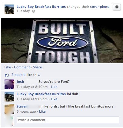 The owner of a fan page on Facebook for a local fast food joint’s breakfast burrito is currently having a meltdown. Instead of the page being about Breakfast Burritos, it is now about lifted Ford trucks, but still retains the Breakfast Burrito name.
