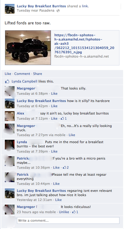 The owner of a fan page on Facebook for a local fast food joint’s breakfast burrito is currently having a meltdown.  Instead of the page being about Breakfast Burritos, it is now about lifted Ford trucks, but still retains the Breakfast Burrito name.