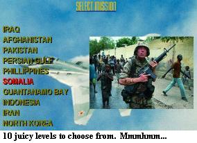 The War Against U.S. Terror is probably the only Game Maker game made to make a political statement. But don’t hate it because it tries to be anti-American. Hate it because its so fucking hard. There’s millions of planes and units that the U.S. has against your own terrorist fighter plane, and believe me you’re going to die in real life before you ever beat all the levels in this game. The main point in the game is to help terrorists fight off the U.S. in all the major wars/battles/confrontations of the last 50 years or so, such as Iraq, Afghanistan, and Somalia. A few that are probably soon to come are tossed in as well, like Iran, North Korea, and Indonesia.