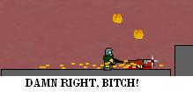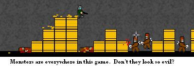The third planet is a desert, ruled by annoying scorpions which you can squish by just stepping on them. Their granddaddies take a lot more firepower to destroy, however. At some points guys fly around in crudely built helicopters trying to machine gun you down, but they can be shot down with two blasts from the sniper rifle or a shot from the tank’s cannon. When you drop into the secret bunker, though, things really start to kick up.