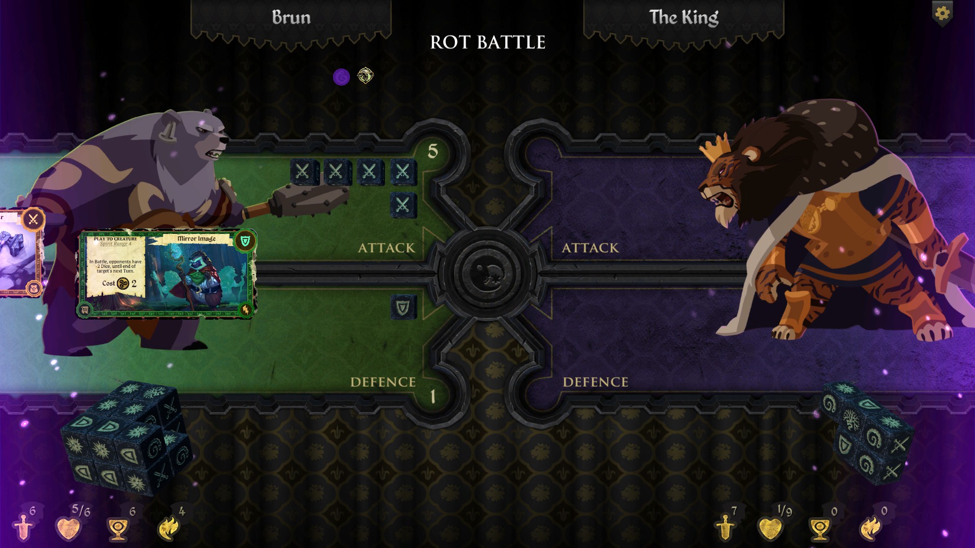 Another way to win is by collecting Spirit Stones to hand over to the King to cure him of his Rot. You can also gain as much Rot as you can so you can defeat the King in battle and rule the lands yourself as a corrupted king. Gaining Rot can help you if you have more than your enemy, as during the attack phases you gain bonus dice to roll. However, Rot can lead to Corruption and with it come instant death on Stone Circle plots. As a result, you are unable to heal without using cards and Rot subtracts one health at the start of every turn if you have any.
