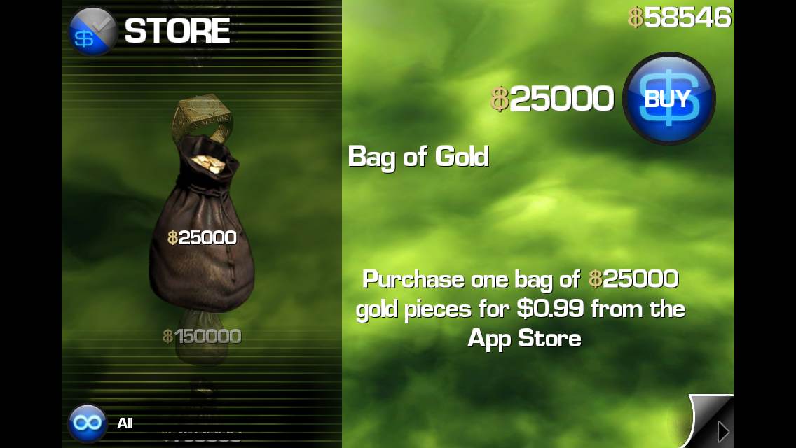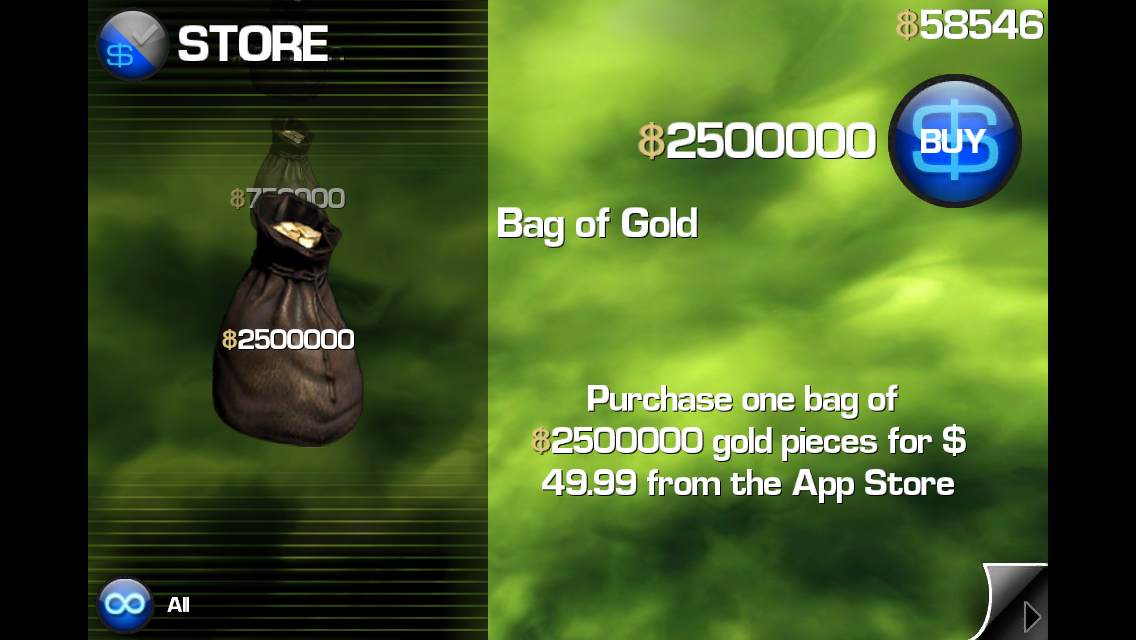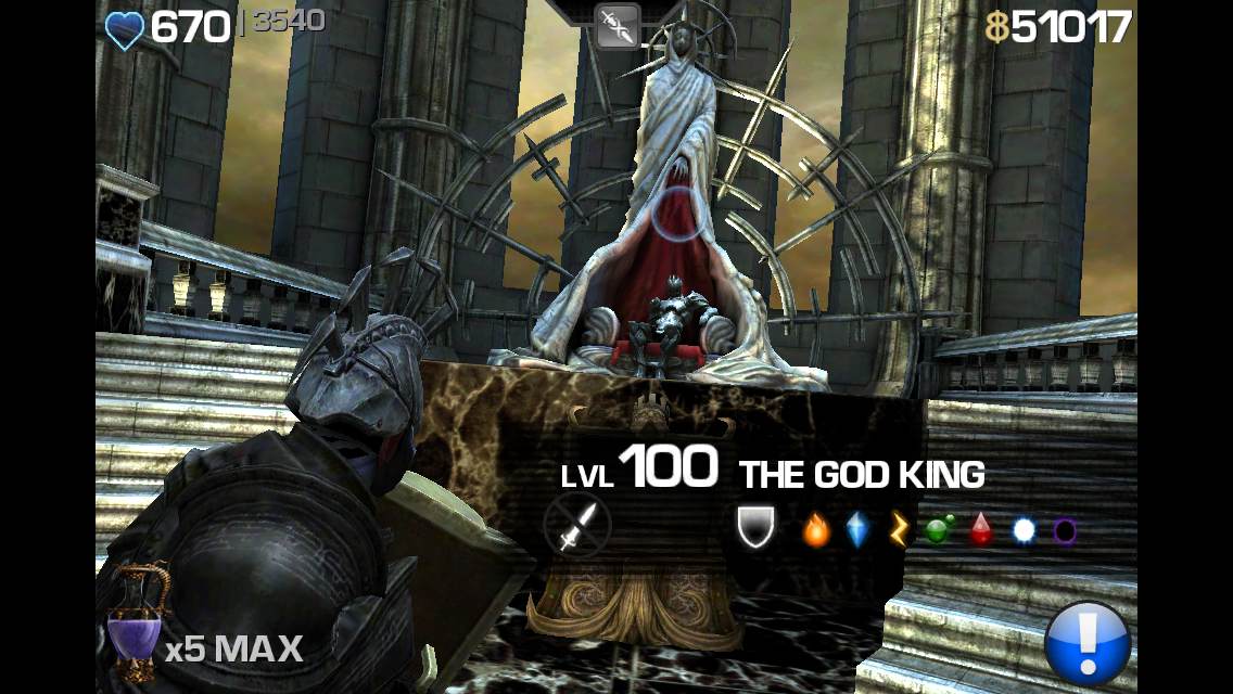 As if endlessly grinding XP and Gold wasn’t enough, they make the prices of this shit so astronomical they “allow” you to buy Gold in the game. 2.5 million Gold-things for 50 bucks or whatever? Doing more research about what you do in the game after you kill the level 50 God King Deathless bum, you are able to purchase the Infinity Blade for 500,000 gold. Using this blade, you can open three or four extra bosses who have levels in the hundreds. So, that’s one reason to keep grinding the game after you’ve “beaten” it.