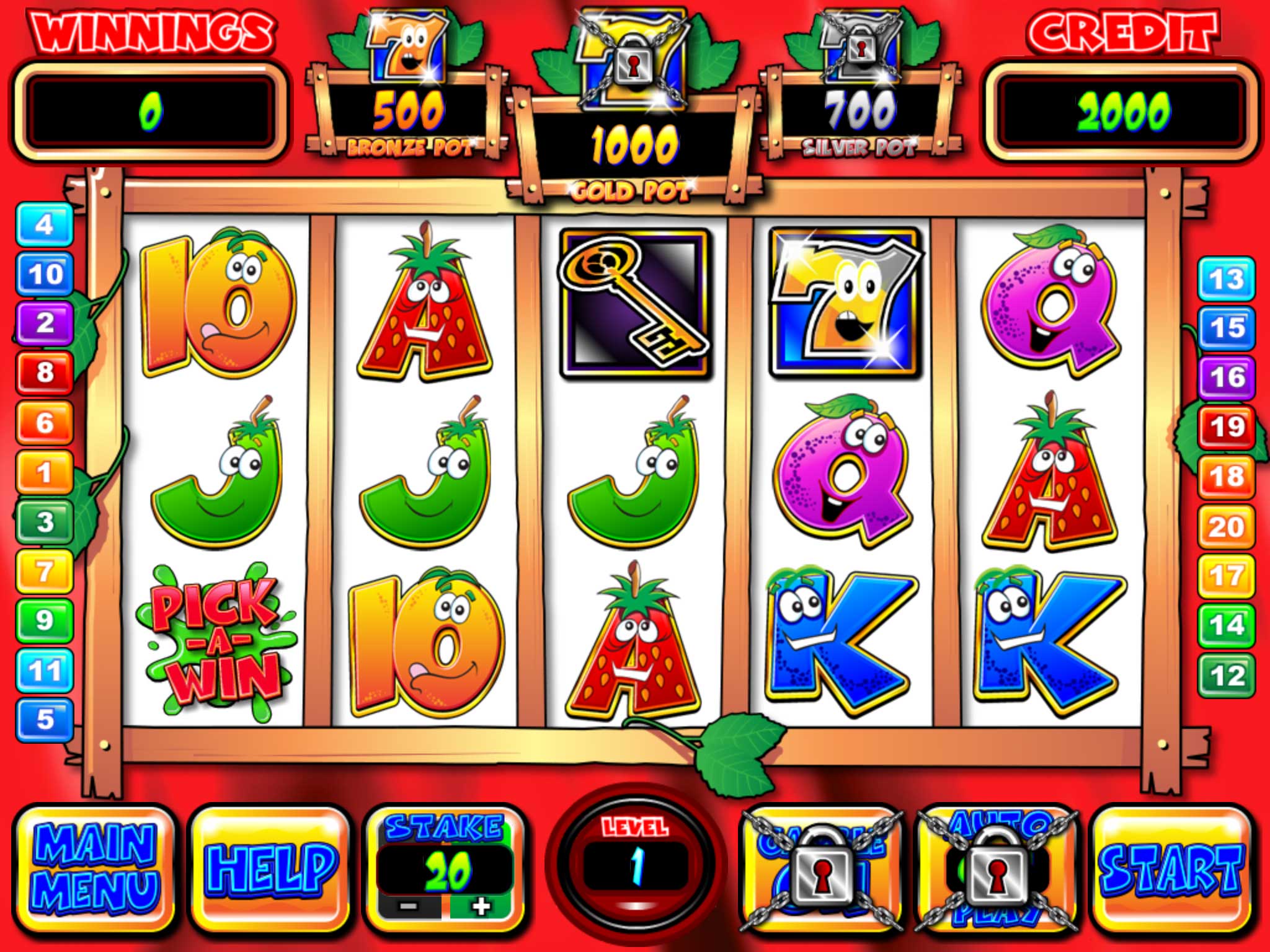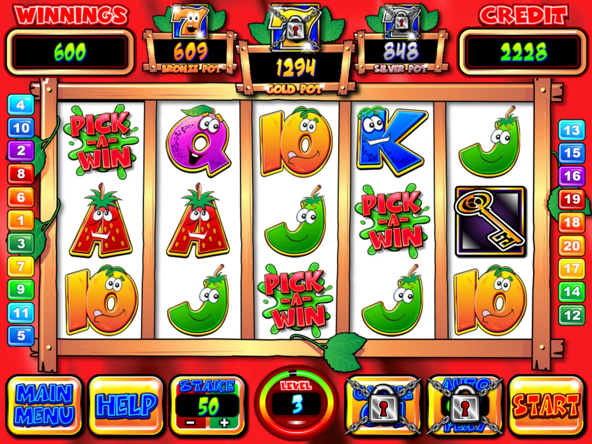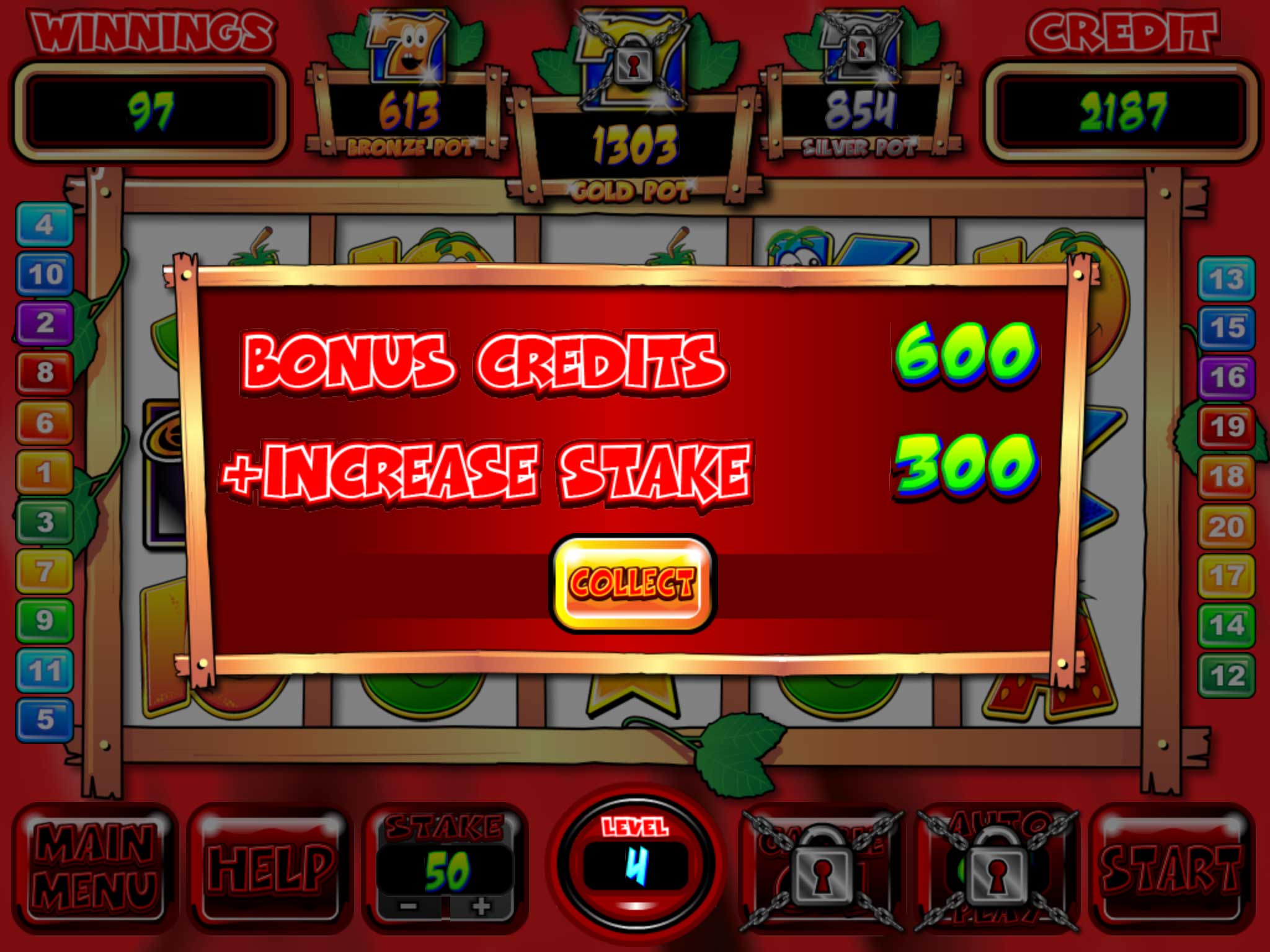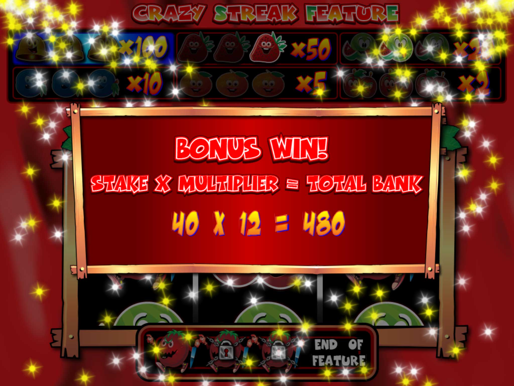 There are also several interesting bonuses. The largest bonus is the three progressive jackpots that slowly grow as you play. The pick-a-win multiplier, in which you choose one of three possible bonuses, multiply your bet by the one that is chosen. The most frequent one I encountered was the Crazy Streak spin bonus in which you will be taken to a 3-slot game that rolls slots automatically. When you gain three of a certain fruit in each of the allocated spaces respectively, you’ll attain the bonus that fruit type is assigned. Once you get the killer tomatoes that require the bonus game to end, the rolls will stop and you’ll receive the payout. This bonus game is pretty fun as you’ll see things slowly fill in and as you progress in levels you’ll be able to last longer against the tomatoes on average.