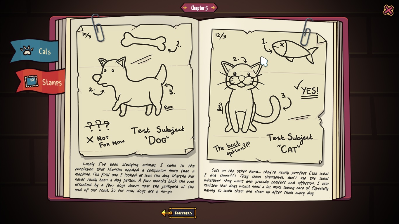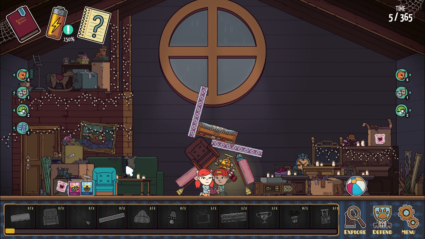 Fort Meow is a physics-based strategy game that involves building forts, cats and bad adult supervision. Playing as young Nia (I see what you did there…), you find yourself at your grandparents’ place only to find them missing. After not calling your parents, and instead rummaging around the attic (like any good horror movie character), the only clue to their whereabouts seems to be hidden somewhere in your grandfather’s journal. The game then tasks you with building fort after fort with household items to defend yourself against a constant onslaught of cats that want to distract you from reading the journal and discovering their nefarious schemes. Along the way, you encounter your grandfather’s flying robot to help you further explore the house and eventually stop the Catpocalypse… Which all seems like a pretty complicated setup for a tower defense puzzle game about evil cats.