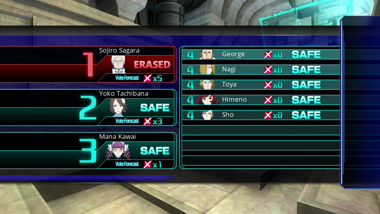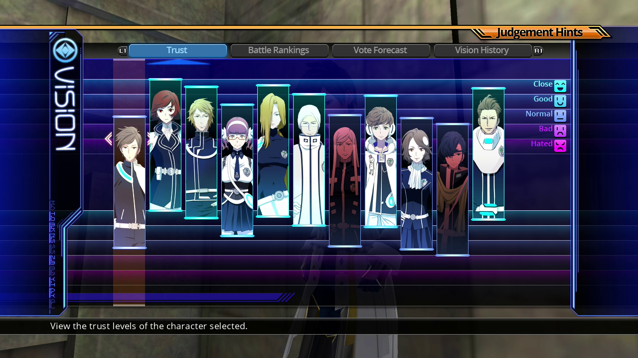 Every floor up the tower, Lost Dimension tasks you with voting for who the traitor is among your ranks and “erasing” them from the party. If the traitor is found, they’ll be eliminated. If not, an innocent teammate will be killed instead and the traitor will then betray you some time later. Usually there are three suspects every floor with a single traitor between them that you will fish out by way of an after-battle cutscene where the main character, Sho, will read the thoughts of his teammates. Then through a mixture of careful positioning and a Vision Point system that allows Sho to dive into the minds of his teammates to discover their true intention, the traitor can be exposed. Once armed with that knowledge, Sho is able to sway his teammates by way of simple dialogue choices at the end of every encounter. Overall, being the games defining gimmick, I didn’t find it exactly inspired but still enjoyable. It gave the game an almost Dangan Ronpa-esque feel to it whenever it came time for a judgment.