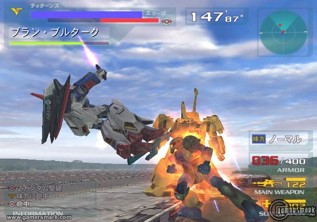 While the controls don’t feel as natural as they should, they can get the job done once you get used to them. However, when in a space battle, which is by far the most frustrating part of the game, the controls become very difficult to use due to some funky moving issues that don’t allow you to move as well as you should in a full 3D arena. Granted, the machines that are flying through space are supposed to be clunky because of their nature, and mobile suit pilots in the animes have trouble commandeering their robots quite frequently, it ends up being more of a frustrating control issue than any sort of homage to the anime. Also, maybe it’s supposed to be gravity or something, but it is really hard to simply move around in space. Having no way to control the camera does not help the cause either. Sometimes when you’re doing nothing, you will slide away to a point away from where you were, drawing farther away from where you were, forcing you to almost struggle to boost away from where you were sliding so you can re-enter the battle. The biggest downside to the whole fighting system is how you’re not allowed to hurt your enemy unless the target on them is red. They will usually turn to yellow after hitting them a certain amount of times. If you try to attack them while the target is yellow, your attacks will very unrealistically (and stupidly, I might add) go right through them; whether it was a rocket or a freakin’ beam sword. This will force you to hold back on your attacks until the target is red again, stopping any chances of relentless combinations and attacks on a particular enemy – a far cry from the sword-slicing-in-half action I’m accustomed to seeing in a Gundam anime. What Universal Century Mode ultimately comes down to is a lot of play time, and that is definitely the game’s main strong point, especially if you enjoy the gameplay or playing with different mobile suits. Containing over 200 missions isn’t too shabby either, even if many of them are repeats. The structure of the game is based on battles rather than being adventure oriented; they basically give you an arena to fight in and send mobile suits to kill you or be killed by you.
