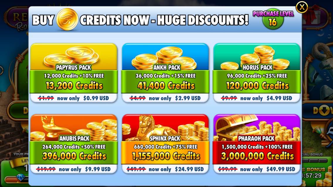 Free bonus credits are earned by increment of four hours as Slots – Pharaoh’s Way had done and still seem to scale higher as you progress — you also get a “special bonus” on every fourth redemption, which is a unique bonus game. The “Money Rain” bonuses (credits you earn as a bonus to leveling up) that occur also scale higher along with your level. Another vital, new, free bonus happens now in the form of a Return Bonus independent of your hourly bonus — if you visit every day your rewards slightly increase as each day goes on.