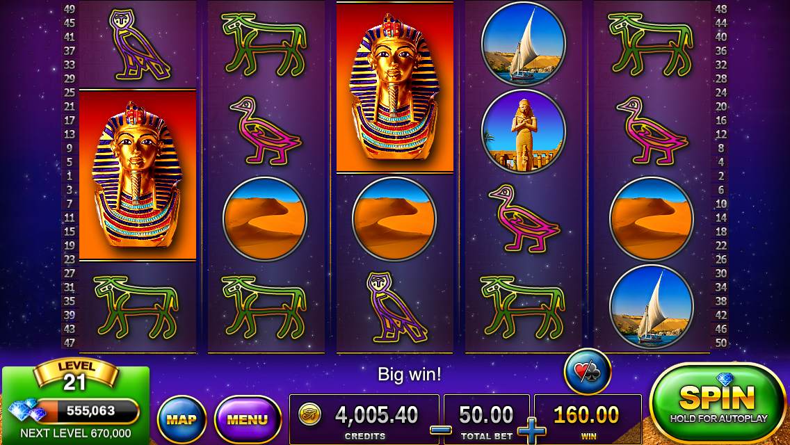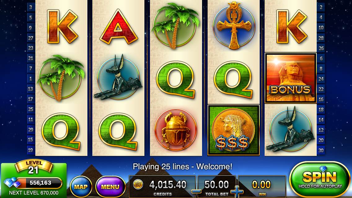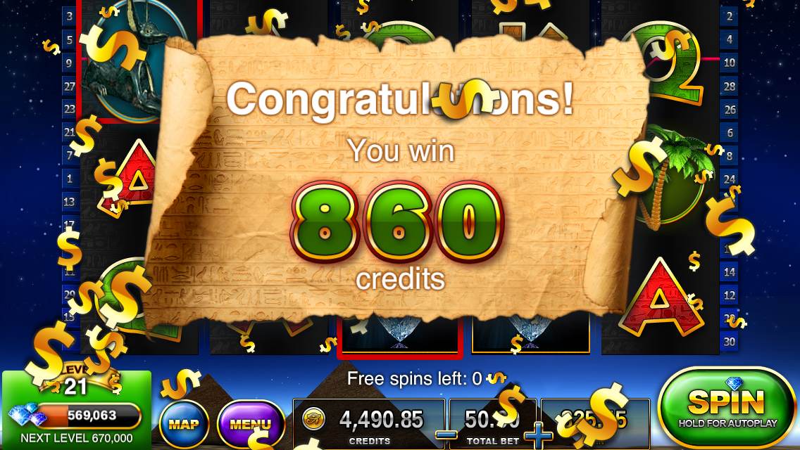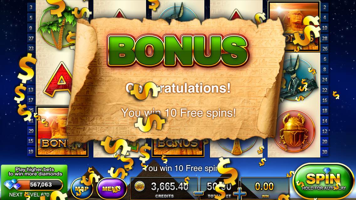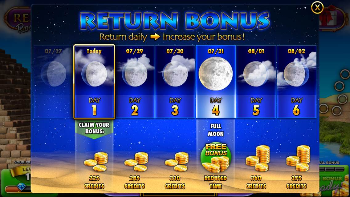 Free bonus credits are earned by increment of four hours as Slots – Pharaoh’s Way had done and still seem to scale higher as you progress — you also get a “special bonus” on every fourth redemption, which is a unique bonus game. The “Money Rain” bonuses (credits you earn as a bonus to leveling up) that occur also scale higher along with your level. Another vital, new, free bonus happens now in the form of a Return Bonus independent of your hourly bonus — if you visit every day your rewards slightly increase as each day goes on.