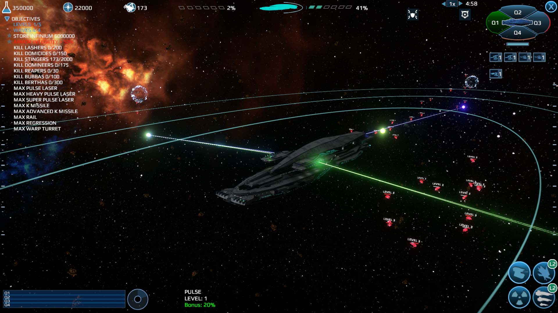 The theme is what kept my interest throughout — a game show taking place in space, hosted by an all-powerful being known as Doctor Kvorak. “Liberate or Obliterate” is the tagline of the “game show” as you decide the fate of a planet Doctor Kvorak chooses; often times populated by worthless-sounding beings. You participate as the character Greeboo from the Planet Noo, and later on, eventually find his “friends” whom you will also control. While Greeboo is just a vessel for you, the player, the real characters of the game are Doctor Kvorak himself and a hen in an astronaut suit named Eggloot. The titular character Doctor Kvorak is the antagonist, and sounds like some sort of weird German stereotype added with a Japanese stereotype; subtitles are really required to understand every word he’s saying. Eggloot is not necessarily a protagonist but antagonizes the antagonist, as they go back and forth with strange writing that all rhymes. Much of the “story” hits on the same points over and over: Doctor Kvorak is an evil omnipotent being, and Eggloot is the thorn in his side. There’s not much in the way of story progression, because you’re going through about fifteen levels of the same formula, but it is all funny/entertaining in the context of the game.