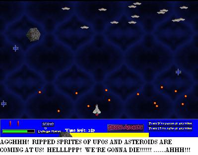 Captain’s log, 0500. We’re going in a straight line now…with UFos, and about 3 other originally drawn ships coming our way. Also going in a straight line. And asteroids. Everywhere. They’re everywhere! Actually they aren’t, there’s only about 1 or 2 ships at a given time, and a random asteroid flying through every now and then.