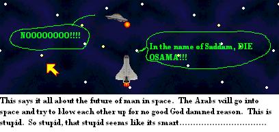 The crappiest part is the whole idea. Space Attacks is gay. It should be called Space Gay, cause that’s what it is. I know they’re transporting dildos to the alien’s homeworld who don’t fucking want human dildos. If they wanted dildos at all, they’d get their own species. They don’t want some long stick thing, they want a flat bumpy thing that you can slap, and waves like jello. Oh wait…I just found the story.